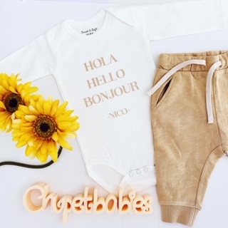 Precioso Body para bebé, HOLA,HELLO,BONJOUR… Elige el color que más te guste y personalízalo con el nombre que desees,manga larga o manga corta.