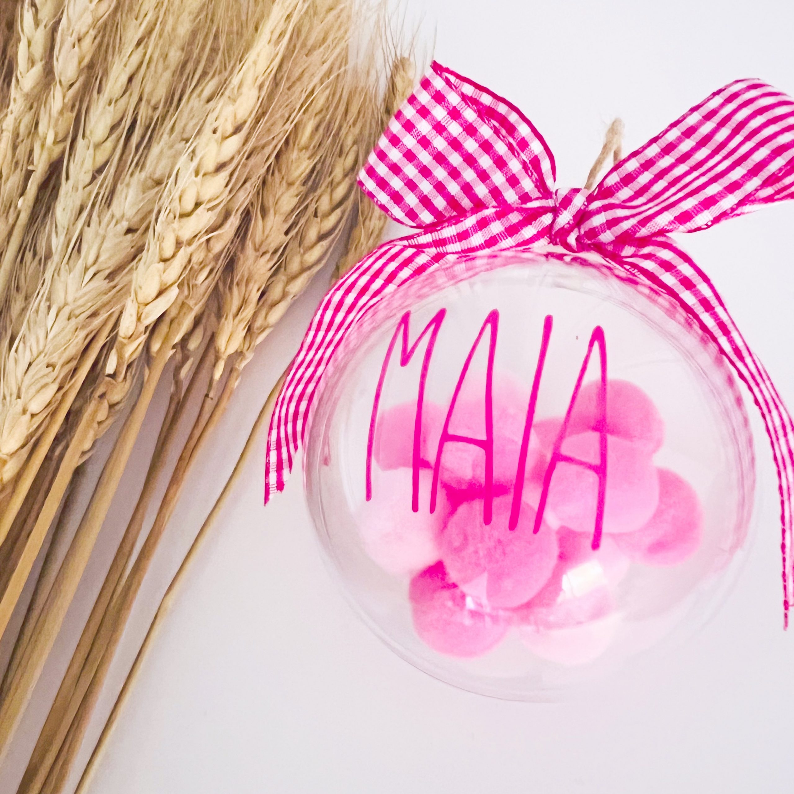 Bola de Navidad personalizada, diámetro de 8cm , relleno dos tonalidades de rosa, lazo vichy fucsia ,vinilo fucsia , in love Pink.