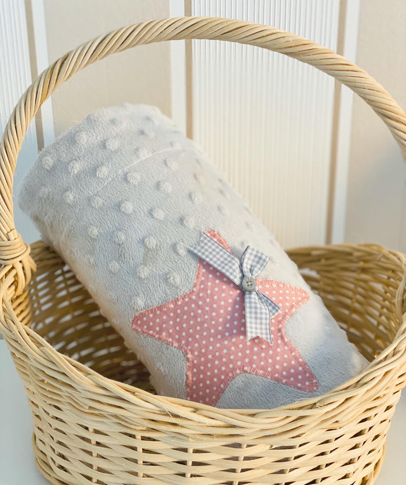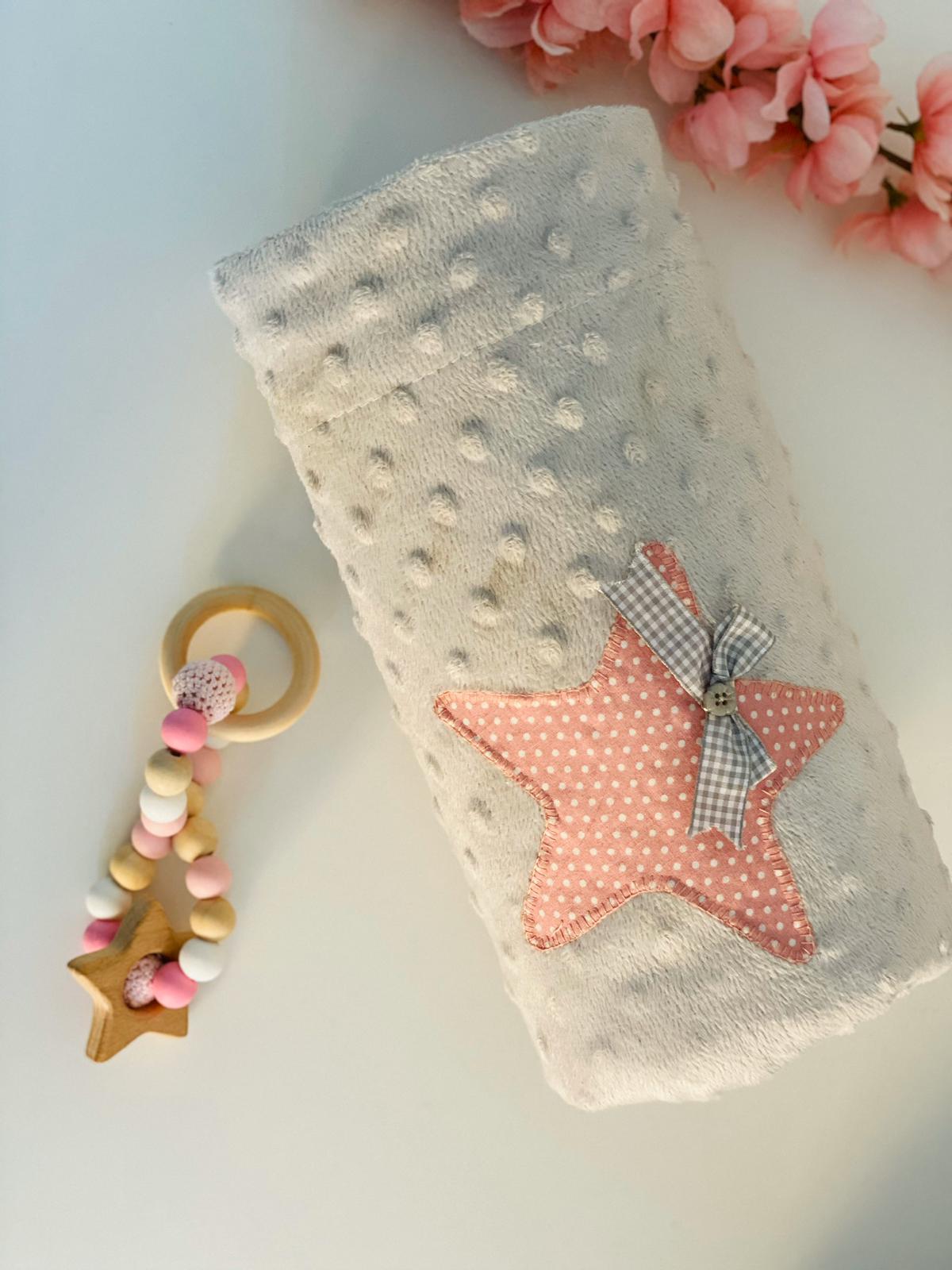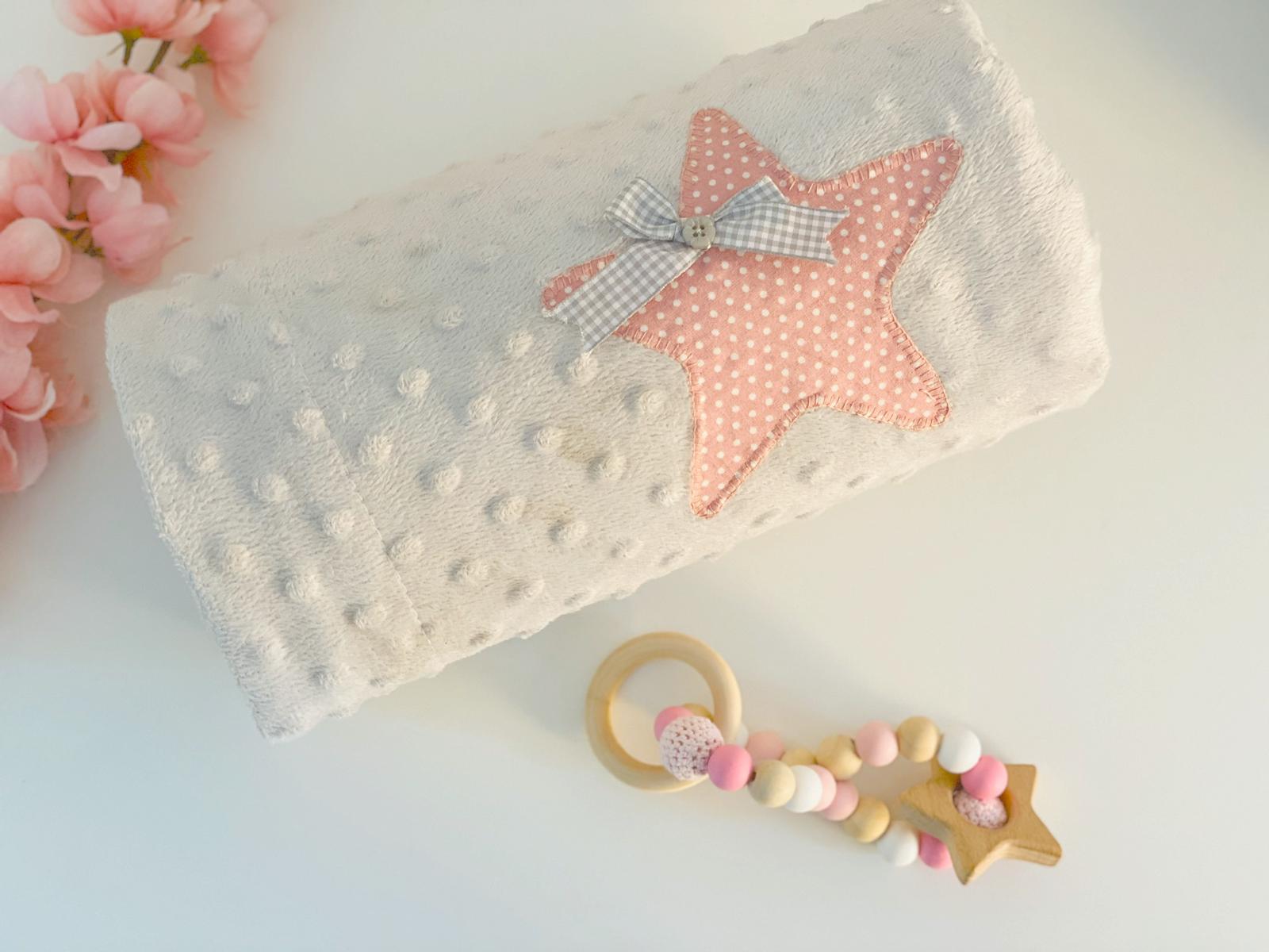 Manta topitos Noa bordada a mano, incluye bordado del nombre y un simbolo,cada letra esta bordada una a una con toda la dulzura del mundo ,pregunte disponibildad de colores. Medidas 80×110.