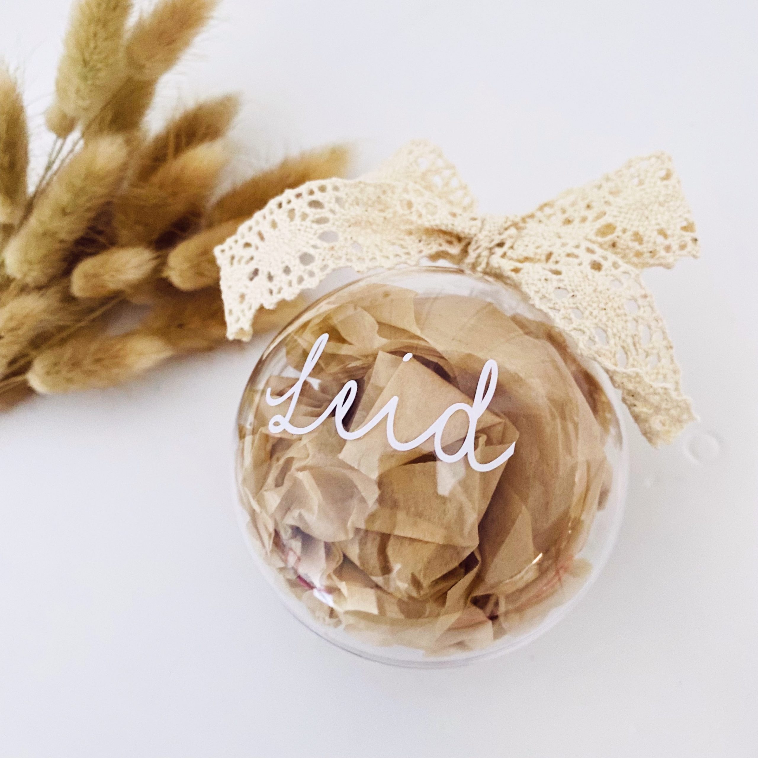 Bola de Navidad personalizada, diámetro de 8cm , relleno beige, lazo de encaje ( en caso de no tener stok como el de la fotografía cambiaríamos un por uno parecido ) vinilo blanco.