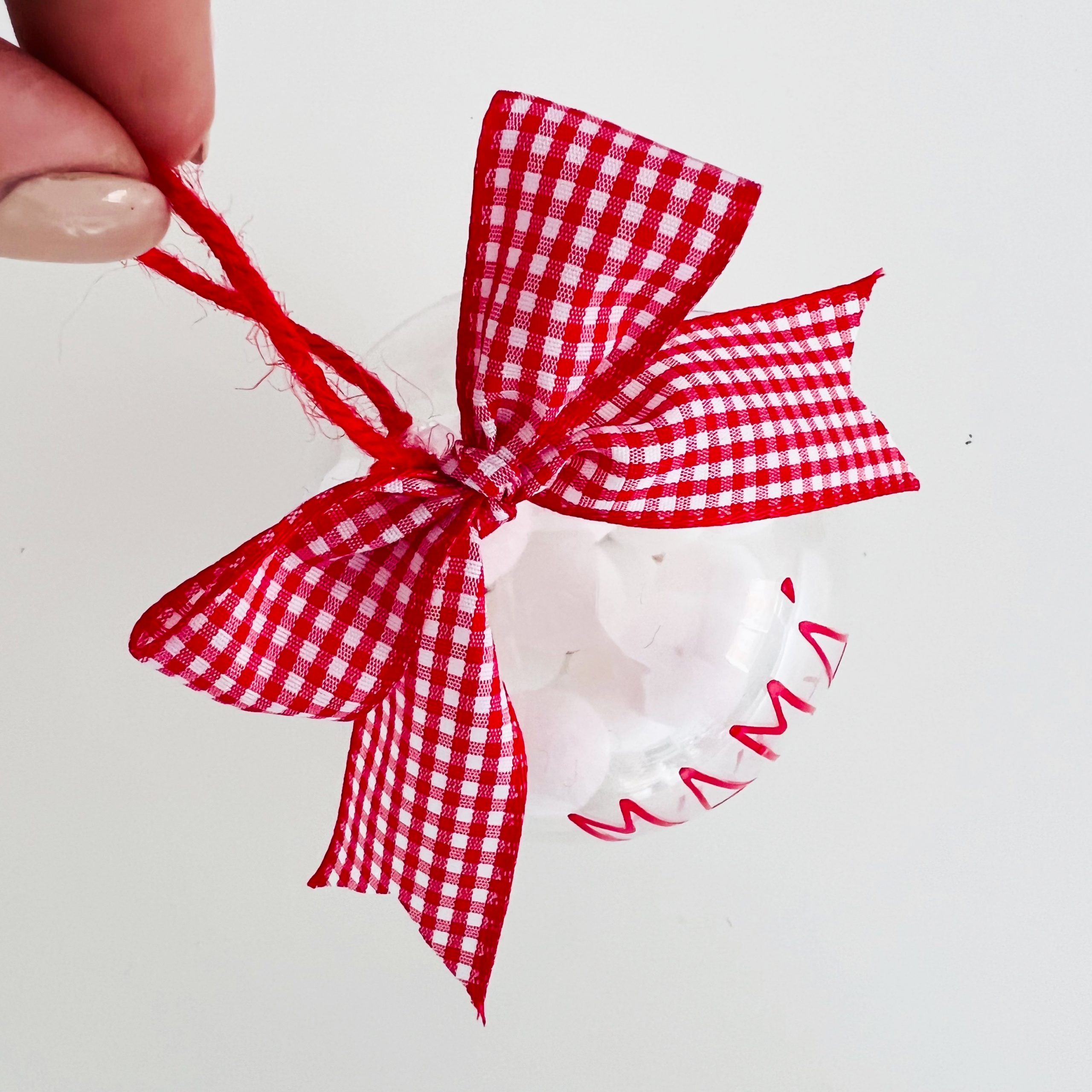 Bola de Navidad personalizada, diámetro de 8cm , relleno blanco, lazo vichy rojo,vinilo negro con corazón en rojo.