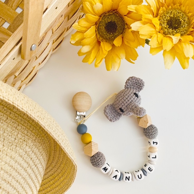 Para ello presentamos este precioso chupetero realizado con crochet de la colección Elephant edicion mustard.